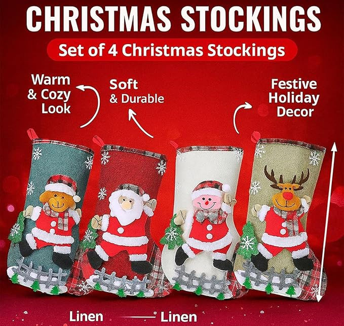 - Set of 4 Premium Linen Stockings: Comes in a pack of 4 beautifully crafted stockings made from durable linen fabric with fine stitching. The rustic design complements all Christmas themes — from traditional red & green to modern minimal aesthetics.