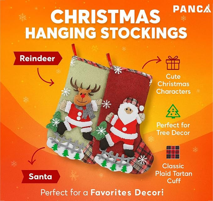 - Perfect Festive Décor for Christmas: Add a classic holiday touch with PANCA Christmas Stockings! Designed with charming festive patterns, these 10-inch linen stockings create a warm, cheerful look on your Christmas tree, doors, windows, or mantelpiece.